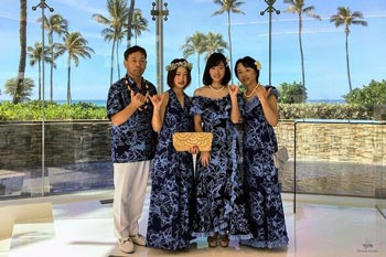 当店へ訪れる迄は、30年前に現地で購入したアロハシャツ&ムームーのカラーがピンク系だったので同じようなカラーをと思っていたのですが、店内で沢山ある品を選んでいるうちにブルー系に決めることになりました。挙式当日はお天気に恵まれ、新郎新婦の「白」、私達夫婦の「青」が最高のロケーション映えになり「このカラーに決めて良かったなぁ〜」と思いました。