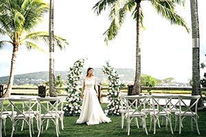 「カベナ・ガーデン・ウェディング」ではウェディングドレスとタキシードのレンタルを含まないので、日本で購入・レンタルされた衣装の持ち込みは自由。本格的なハワイらしいスタイルをお望みなら、ホロク・ハワイウェディングドレス、グルームズマンシャツをムームーレインボーでレンタルすることも可能です。