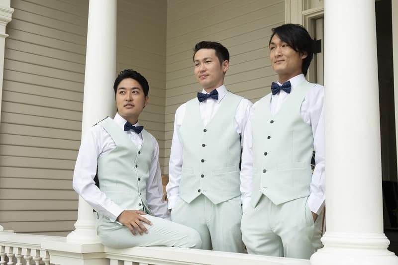 グルームズマンたちのボウタイはドットのボウタイとサスペンダーにしています。