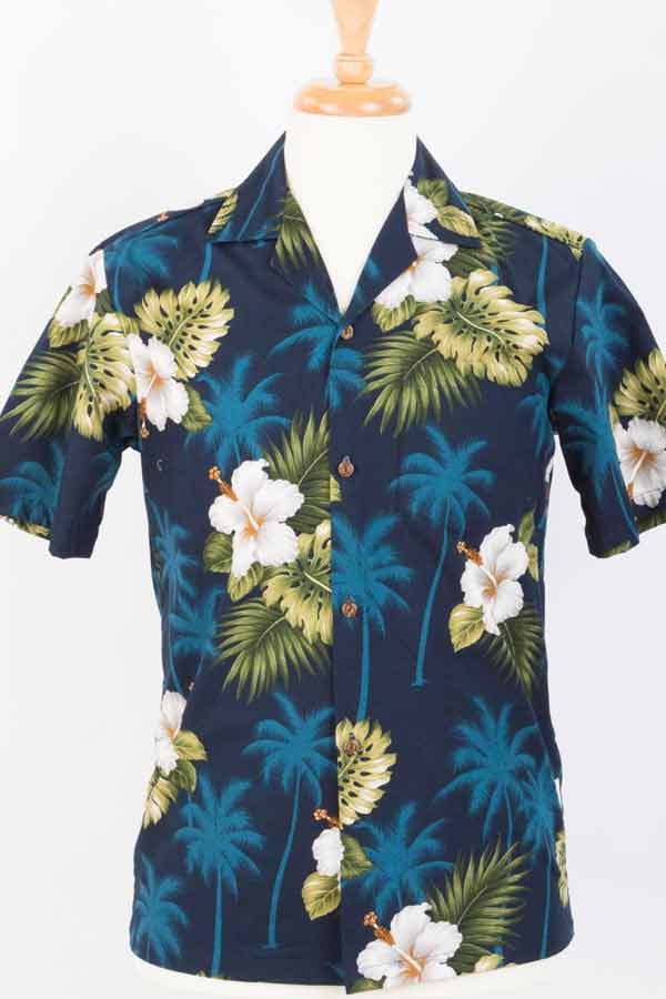 ハイビスカスやしの木柄 ネイビー アロハシャツ